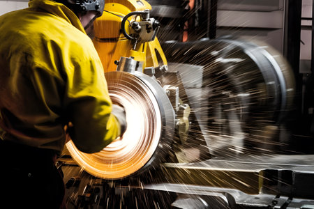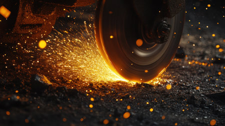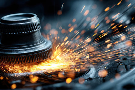 Captivating close-up of a metal grinding process with bright sparks flying in an industrial setting, showcasing the power and precision of craftsmanship in action.