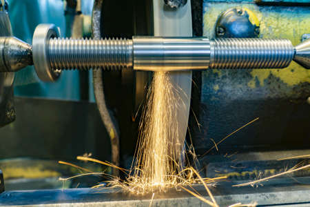 Grinding a threaded shaft on a circular grinding machine with sparks.