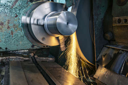 Grinding operations on a surface grinder, metal processing with an abrasive stone with sparks.