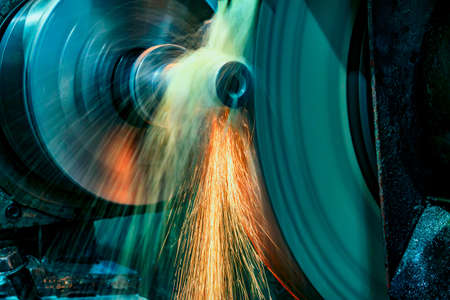 Industrial background, industry, Sparks from grinding machine in workshop.