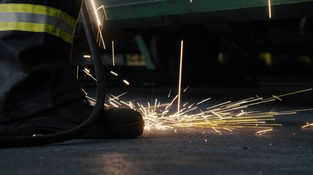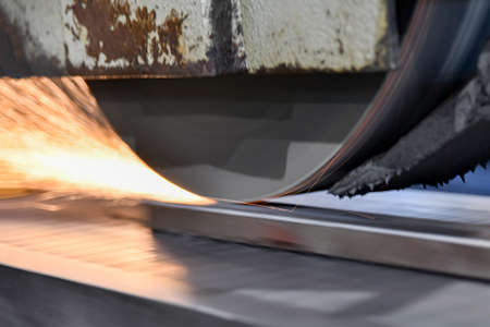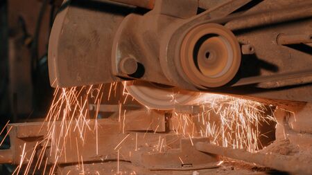 A piece of machinery is in the process of cutting metal. The sparks from the cutting process are flying everywhere, creating a dangerous and intense scene. Concept of danger and excitement