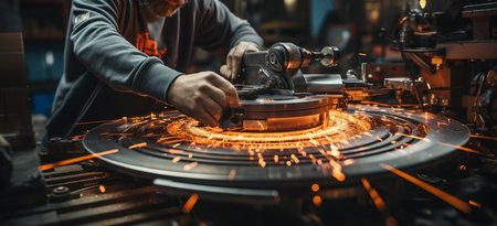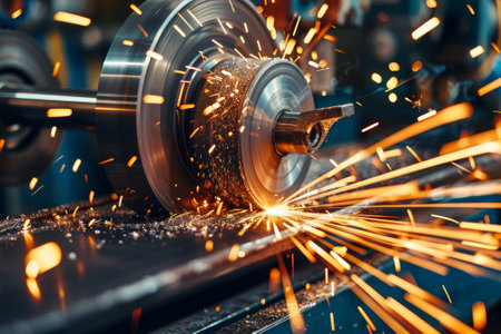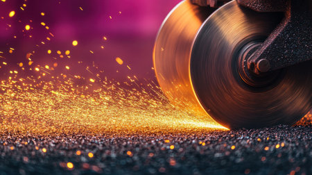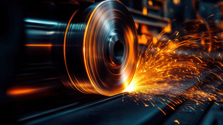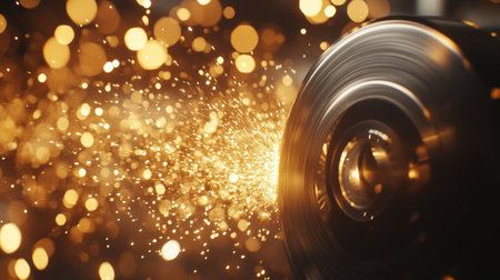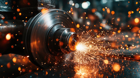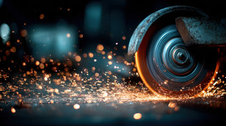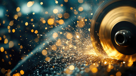 A vibrant image capturing a spinning metal disc in an industrial workshop, creating bright sparks with dynamic light effects. Ideal for depicting craftsmanship.