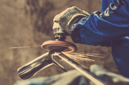 Metal polishing with a hand sander with a polishing disk. Toned image. Hand grinder workflow creation stainless pipe. working process with the sparks close up view