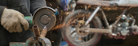 Middle aged Caucasian man using angle grinder while assembling and repairing custom bike in workshop, wearing protective gloves, sparks flying from metal frame, focused on mechanical work