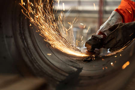 Heavy industry metal work worker using metal grinder machine sharpening a metal pipe close up.
