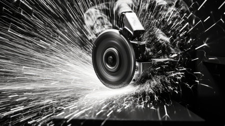A dynamic close-up shot showcasing an industrial cutting tool in motion, creating brilliant sparks against a dark background, illustrating the energy and craftsmanship in a workshop environment.