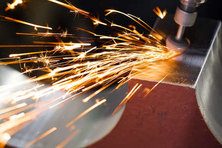 Grinding machine in action with bright sparks.