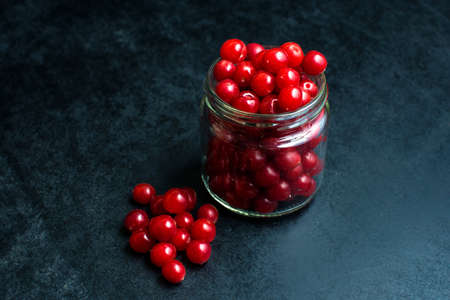 Glass jar full of fruits cherries on black background