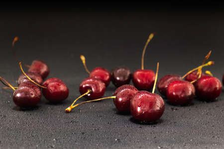 photographed close-up of ripe red cherries covered with water drops, shallow depth of field