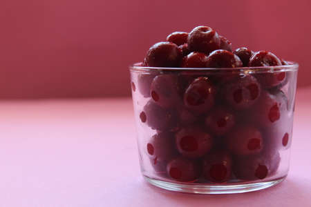 cherry in a glass on a pink red background with a place to text the view from the side close-up of the copyspace