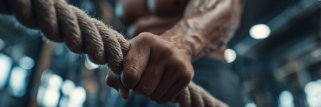 Captivating close-up of strong hands gripping a battle rope in a gym, showcasing the intensity and effort of a dedicated fitness enthusiast pushing limits.