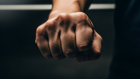 A strong, determined hand forms a tight fist, conveying power, readiness, and resolve. The knuckles are prominent, suggesting strength and potential impact.