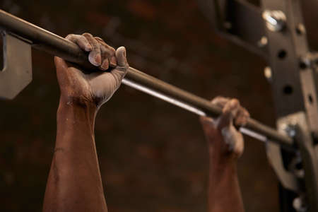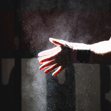 Close-up of a strong man's hands with magnesium powder getting ready to weightlifting at the garage gym.