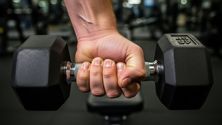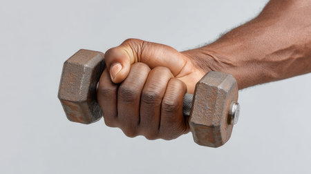 A close-up of a strong hand gripping a dumbbell, symbolizing fitness and strength training. Perfect for health and workout concepts in fitness environments.