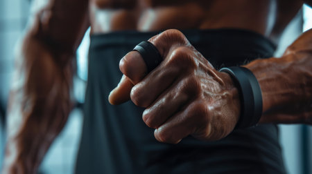 Closeup of a Mans Hand Wearing a Black Fitness Tracker Ring
