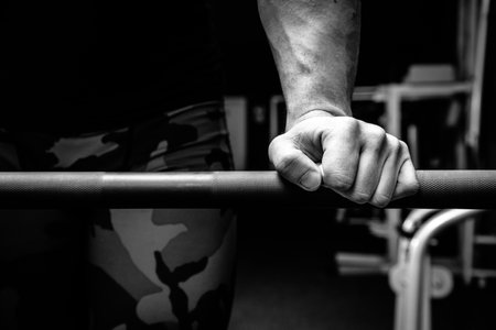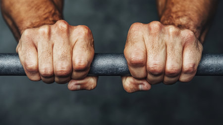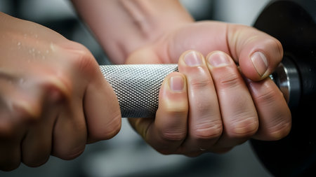 A close-up captures a strong hand firmly gripping a barbell, showcasing the intensity of a workout, highlighting strength, fitness, and the dedication to a healthy lifestyle.