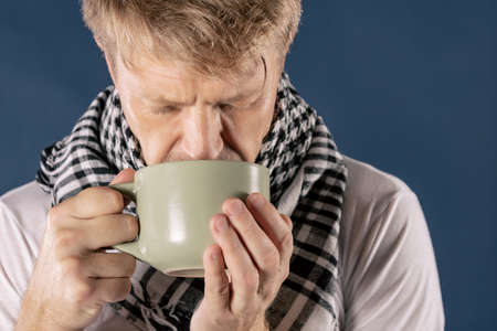 high angle view of an ill man at home, wearing a fluffy gray house robe, warming up with a cup of hot herbal tea