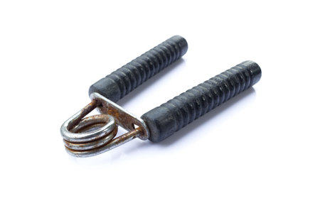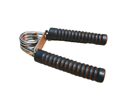 Rubber-handled grip strengthener with metal spring used for hand and forearm muscle training