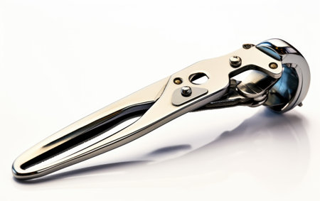 Close-up view of a metal grip tool resting on a workbench, showcasing intricate details in design and engineering, perfect for illustrating precision workmanship.