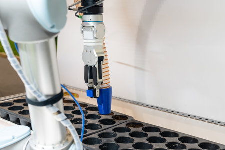 The robot arm is working in a greenhouse. Smart farming and digital agriculture.
