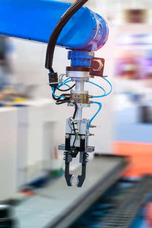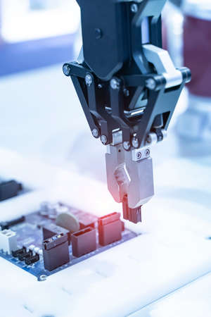 robotic arm catch for electronic assembly line. The robot for smart technology manufacturing process.