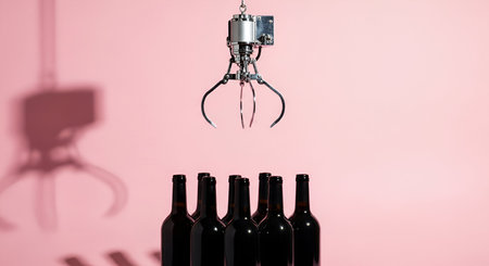 A metallic claw machine arm hovers above a row of dark glass wine bottles. The claw is open, ready to grab one of the bottles. The background is a solid, soft pink color, with a shadow of the claw machine visible on the left.