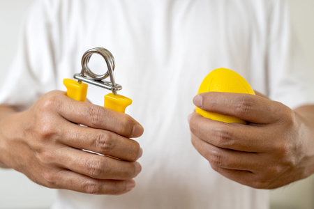 Hands of asian man doing finger,palm and wrist exercise with rubber ball and spring hand gripper,stretch finger,squeeze with hand expander,physical therapy or recovery after injury,health care concept