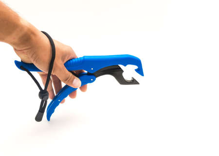 Right hand of Asian fisherman wears adjustable wrist strap holding a fish lip gripper isolated on white background. Blue floating lip grip fishing tool