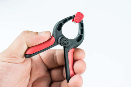 Plastic carpenters pinch tool in the hand above white background with copy space.