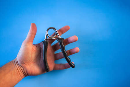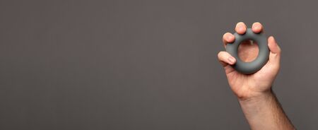 Male hand holds an expander. Expander in a male hand. Banner with space for text.