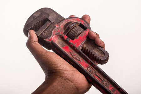 An old beat-up plumber’s wrench which has its red paint partially peeled off