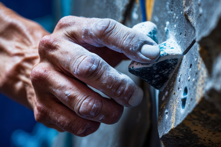 A person is climbing a rock wall with their hands. Concept of determination and physical strength as the person pushes themselves to reach the top of the wall