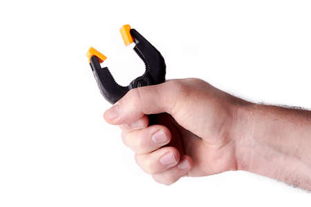construction clothespin clamp in a man's hand on a white background