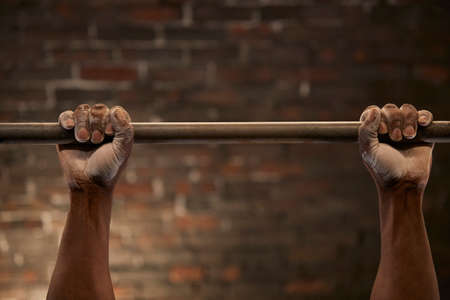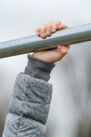 The need for light exercise during the winter. Hands hanging from an iron bar