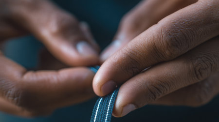 Focused shot of hands stretching and testing polymer blend material that autonomously repairs tears for longlasting durability in active wear