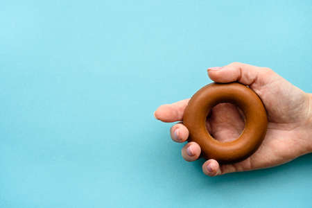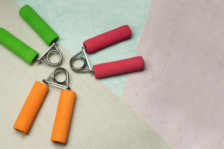 Hand Grip Strengthener in bright colors on mixed color background. hand exercise should be done regularly to reduce the incidence of muscle weakness