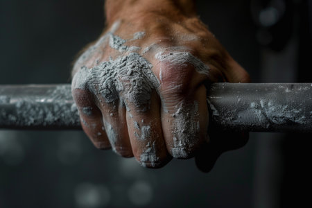 Close-up of mans hands with chalk lifting barbell in gym