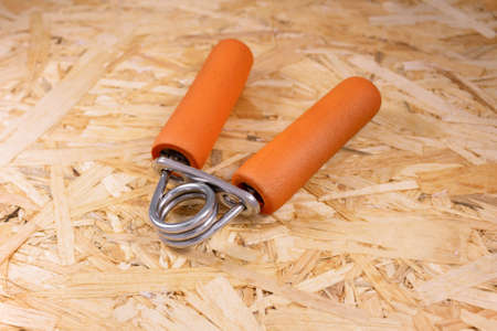 Orange palm trainer espander on wooden surface of pressed sawdust