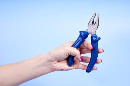 A girl holds pliers in her hand on a blue background