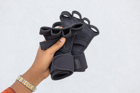 Hand holding black gym gloves with wrist support. Perfect for gym workouts, pull ups, and fitness training, offering maximum hand protection and comfort for peak performance.