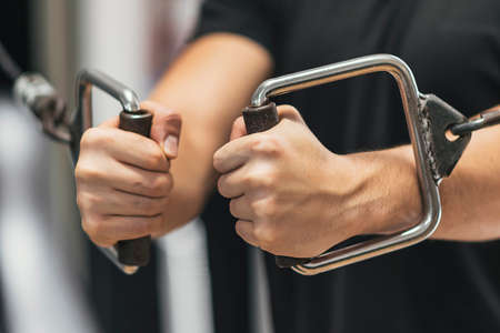 fitness boy pulls pulleys in the gym