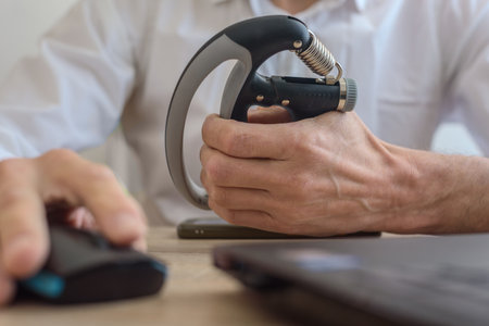 Closeup of male worker using expander at workplace to relief pain after laptop overwork. Male hand squeezing fitness expander next to computer mouse
