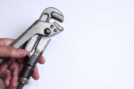 left hand holding a gray pipe wrench on a white background