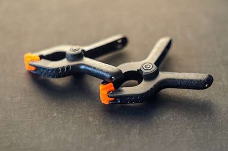 Pair of black clamp with orange plastic jawson on black textured carpenter's bench. Part of the workplace of a carpenter