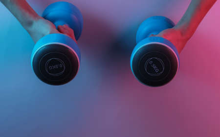 Female hands hold dumbbells. Creative pop art pink blue neon color. Trendy gradient illumination. Night light