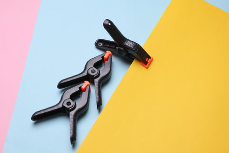 Red and yellow spring clamps. Set of small and medium. Clamping tools for carpentry work.