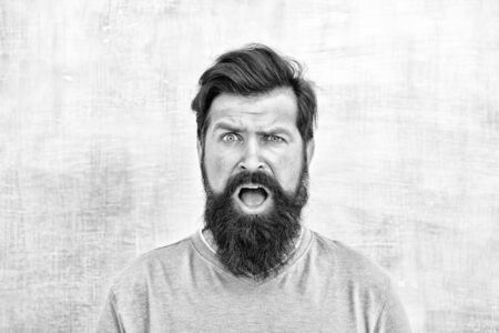 Wondering what. Hipster appearance. Man bearded hipster stylish beard. Stylish beard and mustache care. Beard fashion and barber concept. Perceptions of male beauty around the world. Shocked