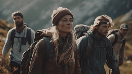 Four hikers with backpacks take a selfie while walking across the mountains. GENERATE AI