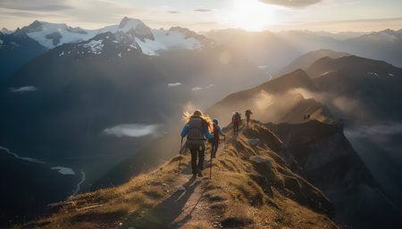 Group of climbers in the rays of the sun in the concept of active extreme sports on the mountain. Hiking climbing adventure travel. AI generated.