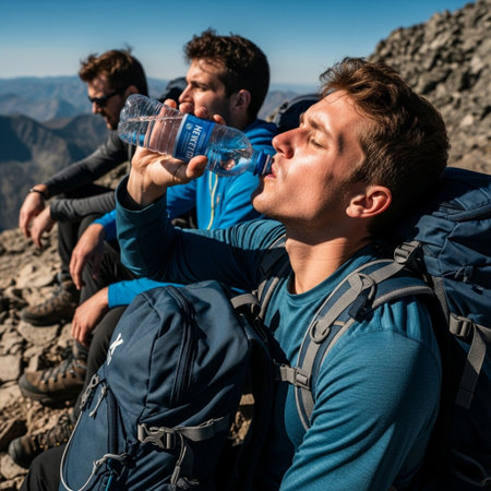 Over-the-shoulder POV of exhausted hikers resting and drinking water on a sunny mountain summit.